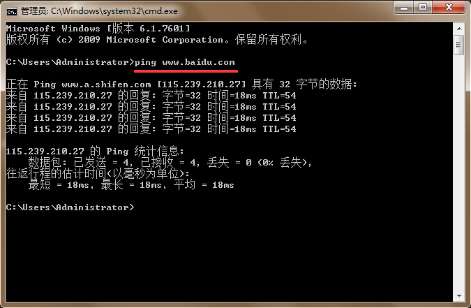 2.在打开的命令窗口中输入“ping www.baidu.com”回车确认。如下图所示