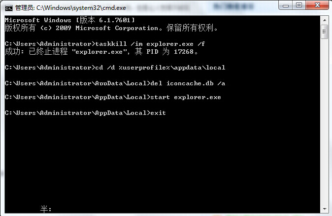2.在打开的命令窗口中,分别输入taskkill /im explorer.exe /f、cd /d %userprofile%\appdata\local、del iconcache.db /a、start explorer.exe、exit回车确认完成操作。如下图所示