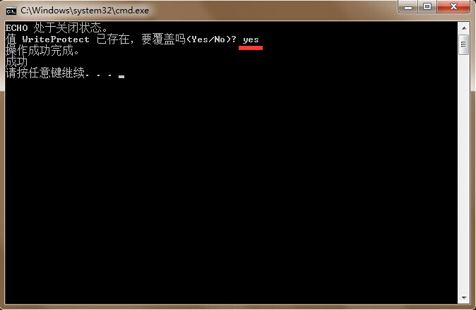 5.如果想要重新让u盘可以读取数据的话,只需要将代码中的00000001改为00000000即可。点击打开修改后的文件,输入yes即可完成操作。如下图所示