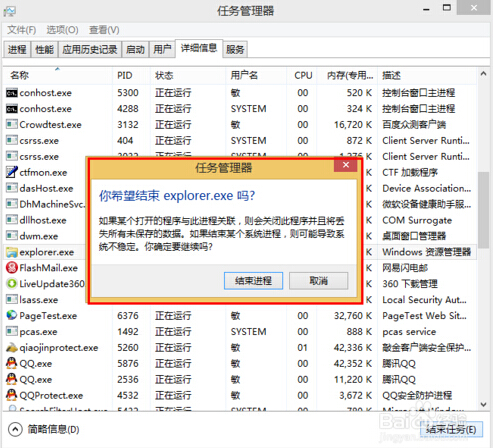 4.下面只要重启“Windows资源管理器”即可,任务栏右键或【ctrl+alt+del】打开任务管理器,找到explorer进程并结束该进程。如下图所示