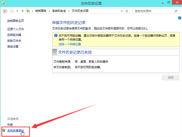 3.在文件历史记录窗口中,点击左下角的“系统映像备份”进入下一步操作。如下图所示