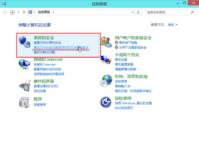 2.在打开的控制面板窗口中,点击打开系统和安全下的“通过文件历史记录保存你的文件备份副本”进入下一步操作。如下图所示