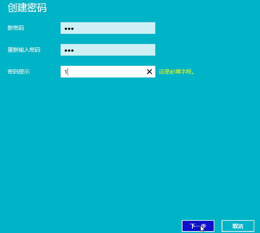 5.输入好密码以及密码提示,点击“下一步”如下图所示
