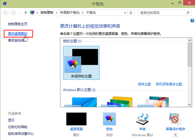 2.在打开的个性化窗口中,点击打开左上角的“更改桌面图标”进入下一步操作。如下图所示