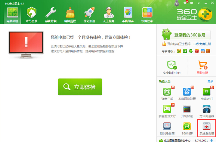 2.进入带网络的安全模式电脑桌面,点击打开360卫士,并且点击打开右下角的系统急救箱,没有的用户可以加载一个。如下图所示