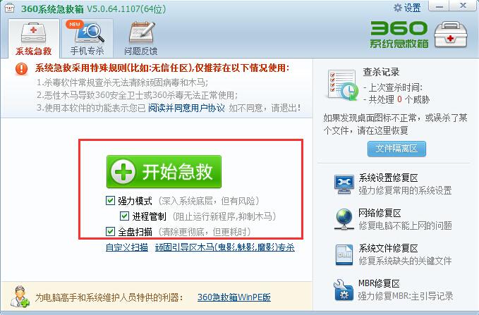 3.在打开的系统急救箱窗口中,勾选“强力模式、进程管制、全盘扫描”点击开始急救,完成操作后重启电脑即可。如下图所示
