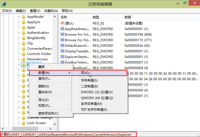 2.在打开的注册表编辑器中,依次展开HKEY_CURRENT_USER\Software\Microsoft\Windows\CurrentVersion\Explorer,在Explorer下面新建该项。直接在Explorer项上点击鼠标右键,然后选择“新建”——“项”,然后将其命名为“Serialize”进入下一步操作。如下图所示