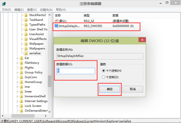 3.在Serialize项右侧窗口中,通过点击鼠标右键,新建一个DWORD值,名称为”StartupDelayInMSec“(不包含引号),然后通过双击该键值将其改为”0“(不包含引号)后,确定即可。如下图所示