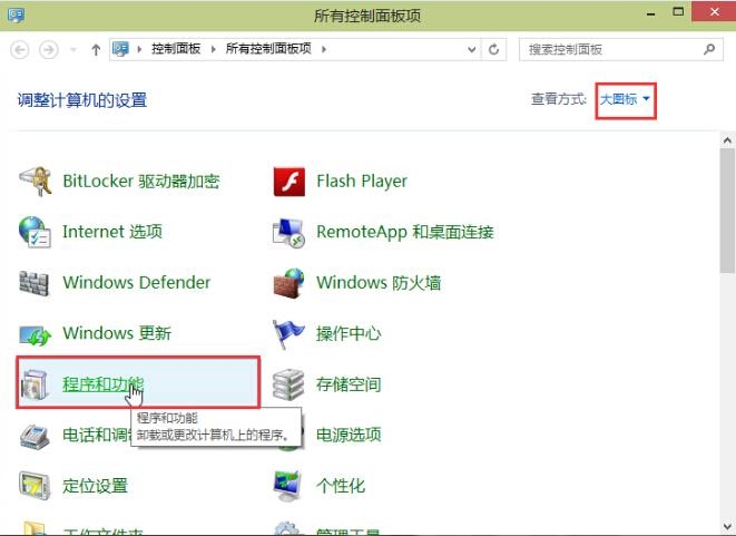 2.在打开的控制面板窗口中,点击查看方式为“大图标”然后点击打开“程序和功能”进入下一步操作。如下图所示