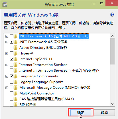 4.在windows功能窗口中,取消勾选想要关闭的系统组件,点击确定完成操作。如下图所示