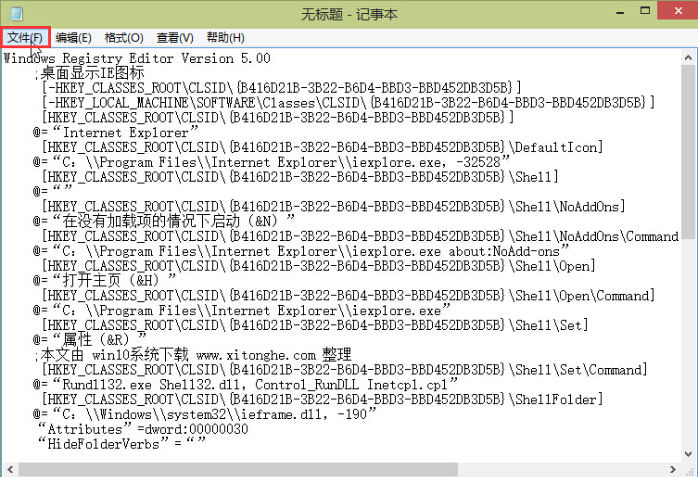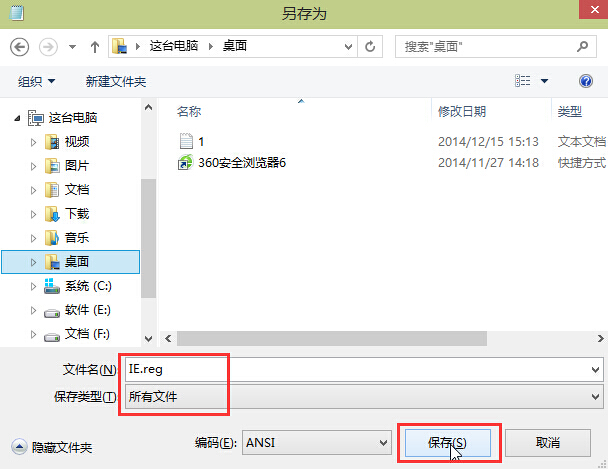 3.点击文件 – 另存为,在另存为窗口中修改文件名为“IE.reg”然后保存类型为“所有文件”点击“保存(S)”进入下一步操作。如下图所示