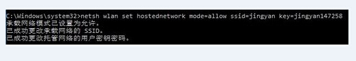 2. 在弹出来的命令提示符中输入:netsh wlan set hostednetwork mode=allow ssid=jingyan key=jingyan147258,回车确认。(其中ssid就是无线热点显示的名称,key是无线热点的密码。)如下图所示