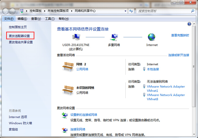 2.在打开的网络和共享中心窗口中,点击“更改适配器设置”进入下一步操作。如下图所示
