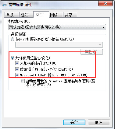 4.在打开的宽带连接属性窗口中,点击选择“允许使用这些协议”然后勾选“未加密的密码、质询握手身份验证协议、Microsoft CHAP 版本2”点击确定完成操作。如下图所示