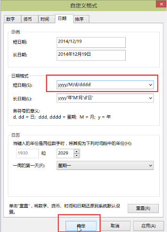 5.在打开的自定义格式窗口中,点击修改短日期后面方框中的英文为“yyy/M/d/dddd“点击确定完成操作。如下图所示