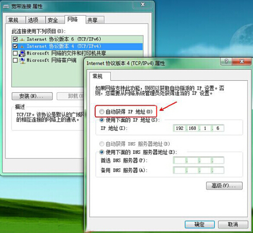 3.右键单击“宽带连接”,点击打开“属性”,双击“网络”标签下的“Internet 协议版本 4 (TCP/IPv4)”,选择“自动获得 IP 地址”,点击“确定”即可。如下图所示