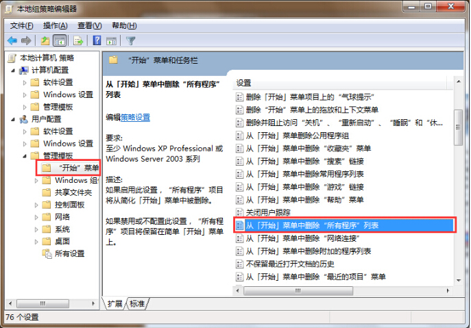 2.在打开的本地策略组编辑器窗口中,依次展开用户配置 – 管理模板 – 开始菜单中的“从【开始】菜单中删除“所有程序”列表”如下图所示