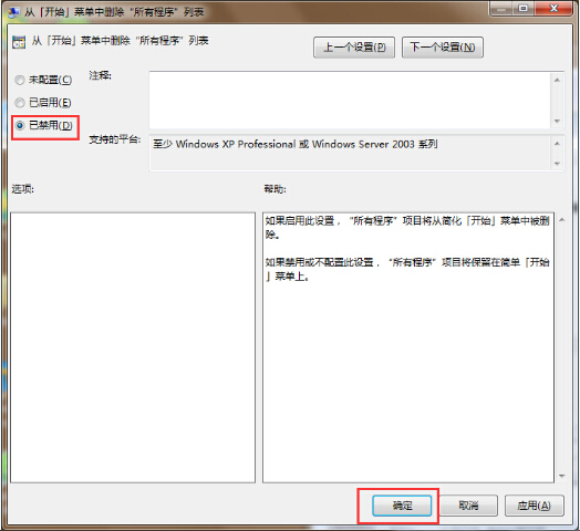 3.点击打开从【开始】菜单中删除“所有程序”列表,然后点击选择“已禁用(D)”点击确定完成操作。如下图所示