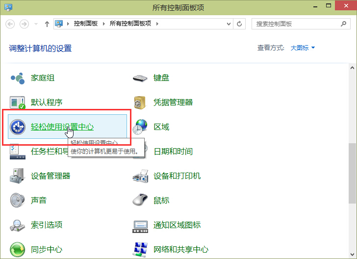 2.在打开的控制面板窗口中,点击打开“轻松使用设置中心”进入下一步操作。如下图所示