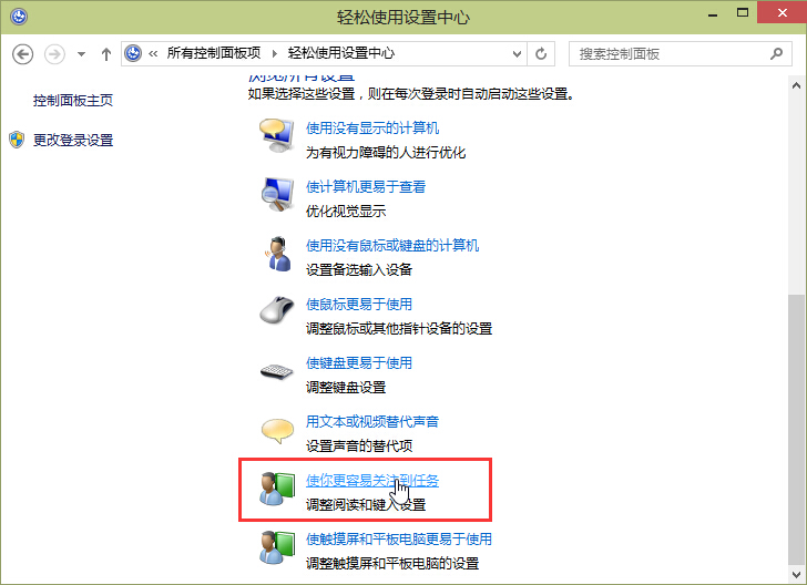 3.在轻松使用设置中心界面中,找到“使你更容易关注到任务”然后点击打开。如下图所示