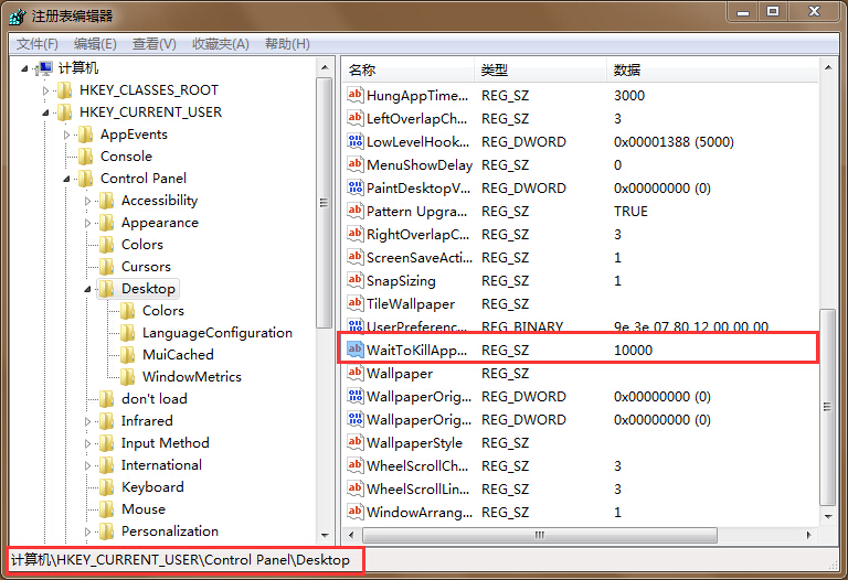 2.在打开的注册表编辑器窗口中,依次展开HKEY_CURRENT_USER\Control Panel\Desktop并且在Desktop右侧找到“WaitToKillAppTimeout”进入下一步操作。如下图所示