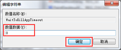 3.双击打开WaitToKillAppTimeout,把该键值的数值从1000修改为“0”,点击“确定”之后就可以关闭注册表编辑器了。如下图所示