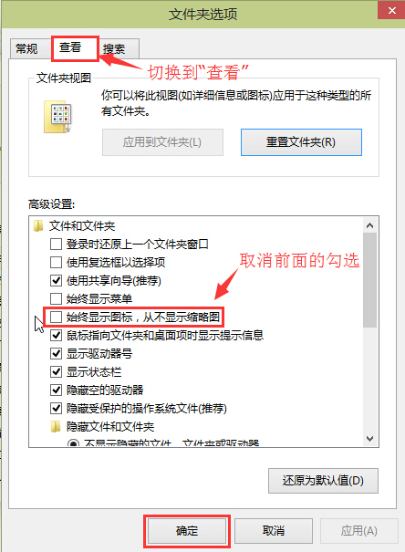 2.在打开的文件夹选项窗口中,将界面切换到“查看”项下,然后找到“始终显示图片,从不显示缩略图”取消前面的默认勾选,点击“确定”完成操作。如下图所示