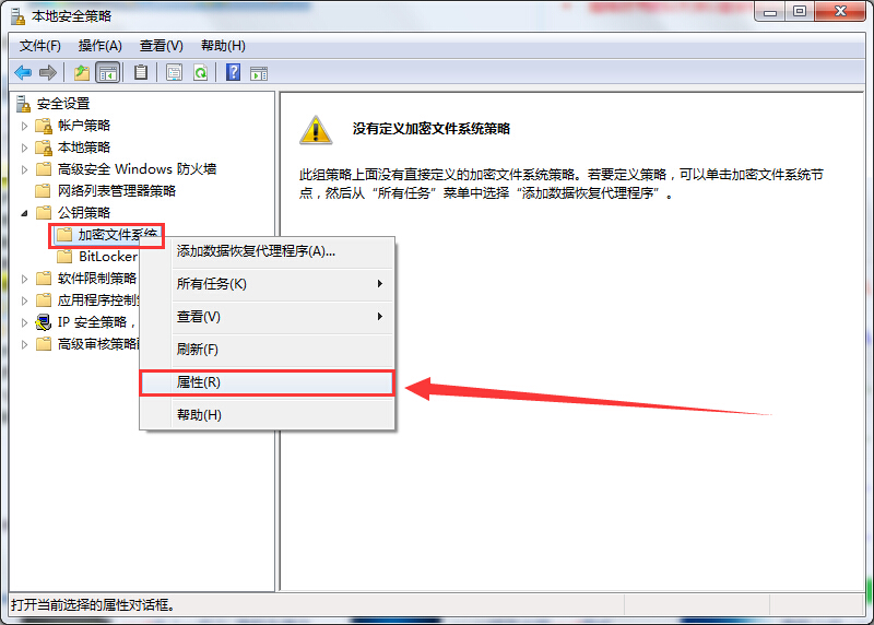 2.在打开的本地安全策略窗口中,点击展开公钥策略然后右键其中的“加密文件系统”点击打开加密文件系统属性窗口。如下图所示