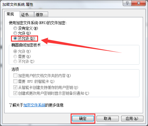 3.在打开的属性窗口中,点击选择使用加密文件系统(EFS)的文件加密下的“不允许(D)”然后点击确定完成操作。如下图所示