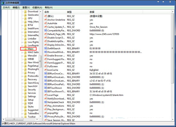 2.在打开的注册表编辑器窗口中,依次展开HKEY_CURRENT_USER\Software\microsoft\Internet Explorer\Main。如下图所示