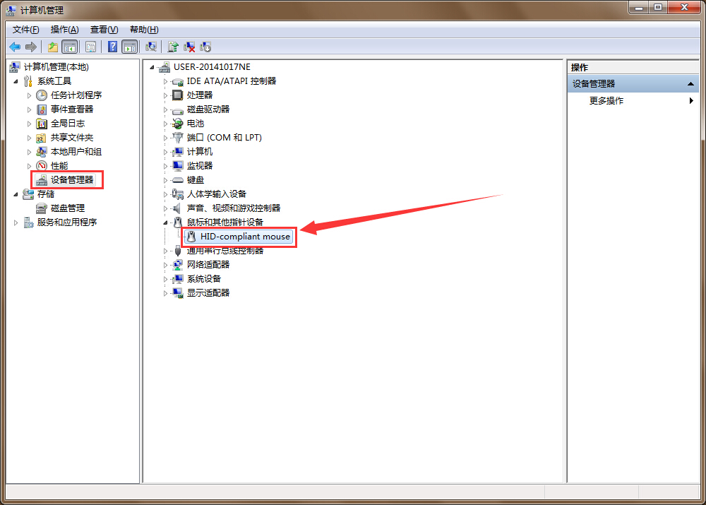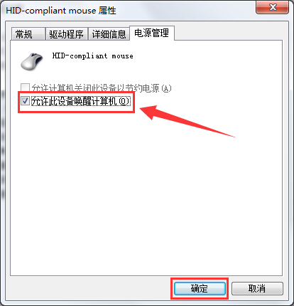 2.点击打开HID-compliant mouse,在打开的HID-compliant mouse属性窗口中,切换到电源管理项界面,点击勾选“允许此设备唤醒计算机(O)”点击确定完成操作。如下图所示