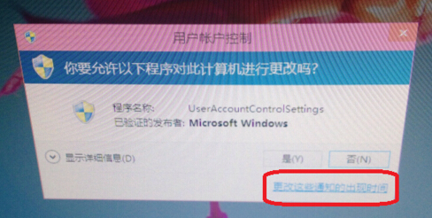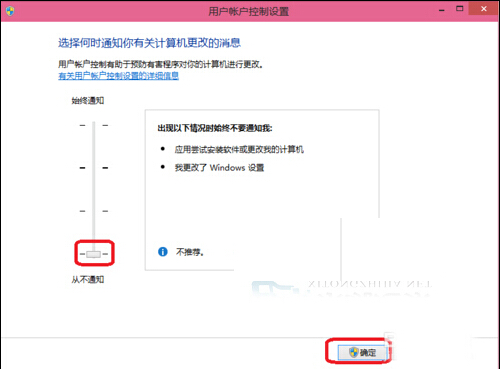 2.在弹出的用户账户控制设置窗口中,将滚动条从始终通知拖动到从不通知,然后点击确定完成操作。如下图所示