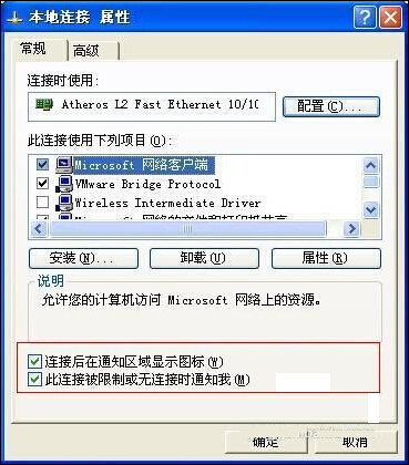 3.在打开的本地连接属性窗口中,勾选“连接后在通知区域显示图标(W)”和“此连接被限制或无连接时通知我(M)”,然后点击确定完成操作。如下图所示