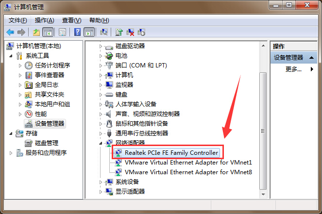 2.在打开的计算机管理窗口,首先点击“设备管理器”然后在右侧找到“网络适配器”点击展开。如下图所示