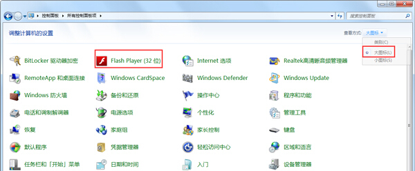 2.在打开的控制面板窗口中,点击选择查看方式为“大图标”然后找到并且点击打开“Flash Player”。如下图所示