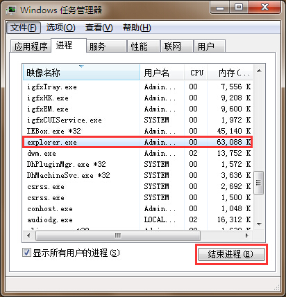 2.在打开的任务管理器窗口中,找到并且选中“explorer.exe”进程,点击“结束进程”结束该进程。如下图所示
