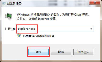 3.下面在任务管理器窗口中,点击文件 - 新建任务,点击创建一个新任务,在弹出的新建任务窗口中输入“explorer.exe”点击确定完成操作。如下图所示