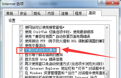 2.在弹出的Internet选项窗口中,切换到“高级”栏界面下,拖动滚动条找到“下载完成后发出通知”并且点击勾选,最后点击确定完成设置。如下图所示