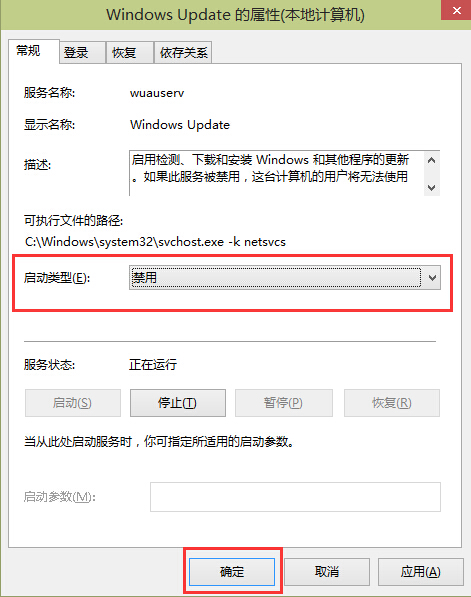 3.双击打开Windows Update服务,在打开的Windows Update的属性窗口中,将启动类型改为“禁用”点击确定完成操作。如下图所示