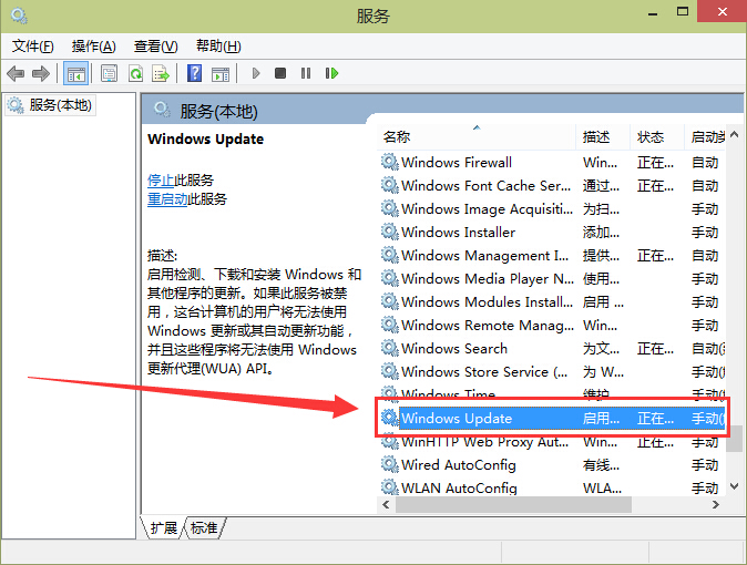 2.在打开的服务窗口中,拖动滚动条找到“Windows Update”服务。如下图所示