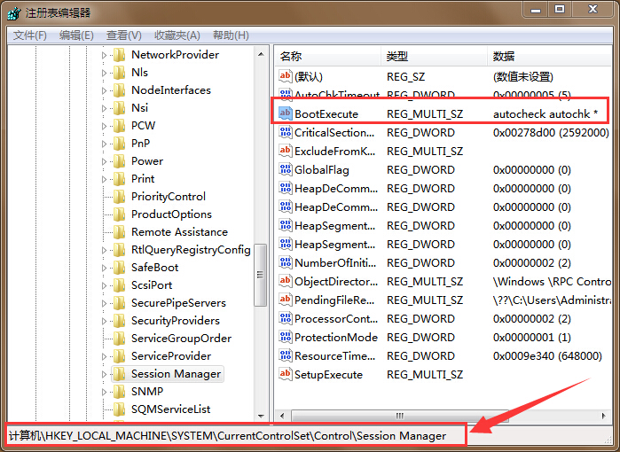 2.在打开的注册表编辑器窗口中,依次展开HKEY_LOCAL_MACHINE\SYSTEM\CurrentControlSet\Control\Session Manager,并且在右侧的子键窗口中找到BootExecute键值项。如下图所示