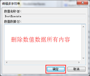 3.双击打开BootExecute键值项,在打开的编辑多字符串窗口中将BootExecute的所有数值数据删除,然后点击确定完成操作并且重启电脑即可。如下图所示