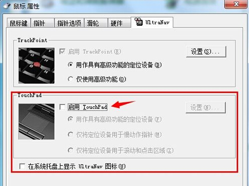 2.在弹出的的鼠标属性窗口中,将界面切换到“UltraNav”栏下,点击取消勾选“启用TouchPad”点击确定完成操作。如下图所示