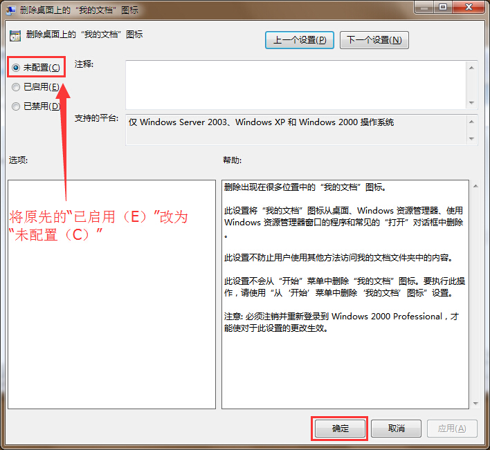 3.双击打开“删除桌面上的“我的文档”图标”,最后在弹出的窗口中,将原本的“已启用(E)”改为“未配置(C)”,点击确定完成操作。如下图所示