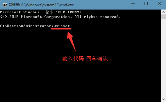 2.在弹出的命令提示符窗口中,输入“wsreset”回车确认开始清除应用商店缓存,并且耐心等待缓存的清除过程即可。如下图所示