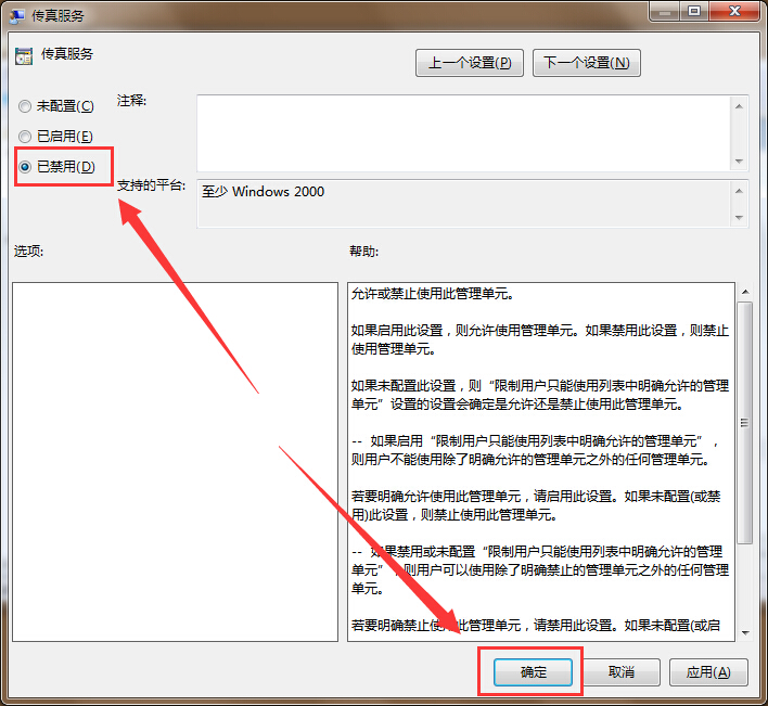 3.最后在弹出的传真服务窗口中,点击选择“已禁用(D)”然后点击确定完成操作。如下图所示