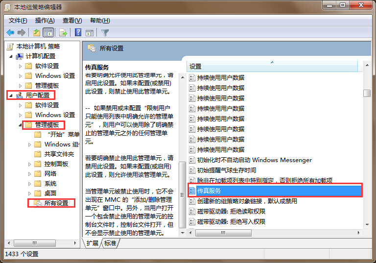 2.在打开的本地组策略编辑器窗口中,依次展开用户配置 - 管理模板 - 所有设置,并且在所有设置右侧界面中拖动滚动条找到“传真服务”。如下图所示
