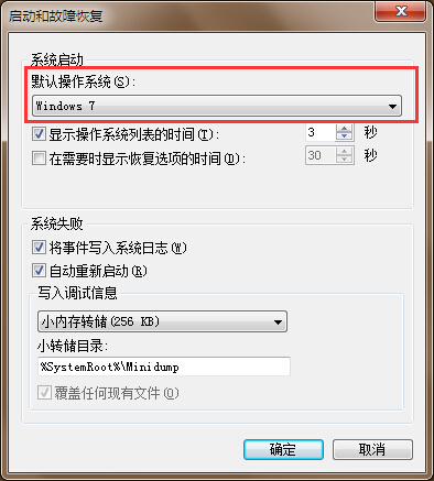 4.最后在启动和故障恢复窗口中,点击选择需要设置为默认操作的系统即可,然后点击确定完成操作。如下图所示