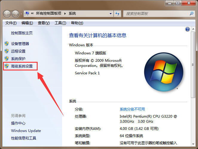 2.在打开的计算机属性窗口中,点击“高级系统设置”打开高级系统设置窗口。如下图所示