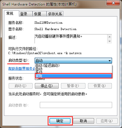 3.双击打开“Shell Hardware Detection”服务,在弹出的窗口中,将启动类型改为“禁用”点击确定完成操作。如下图所示